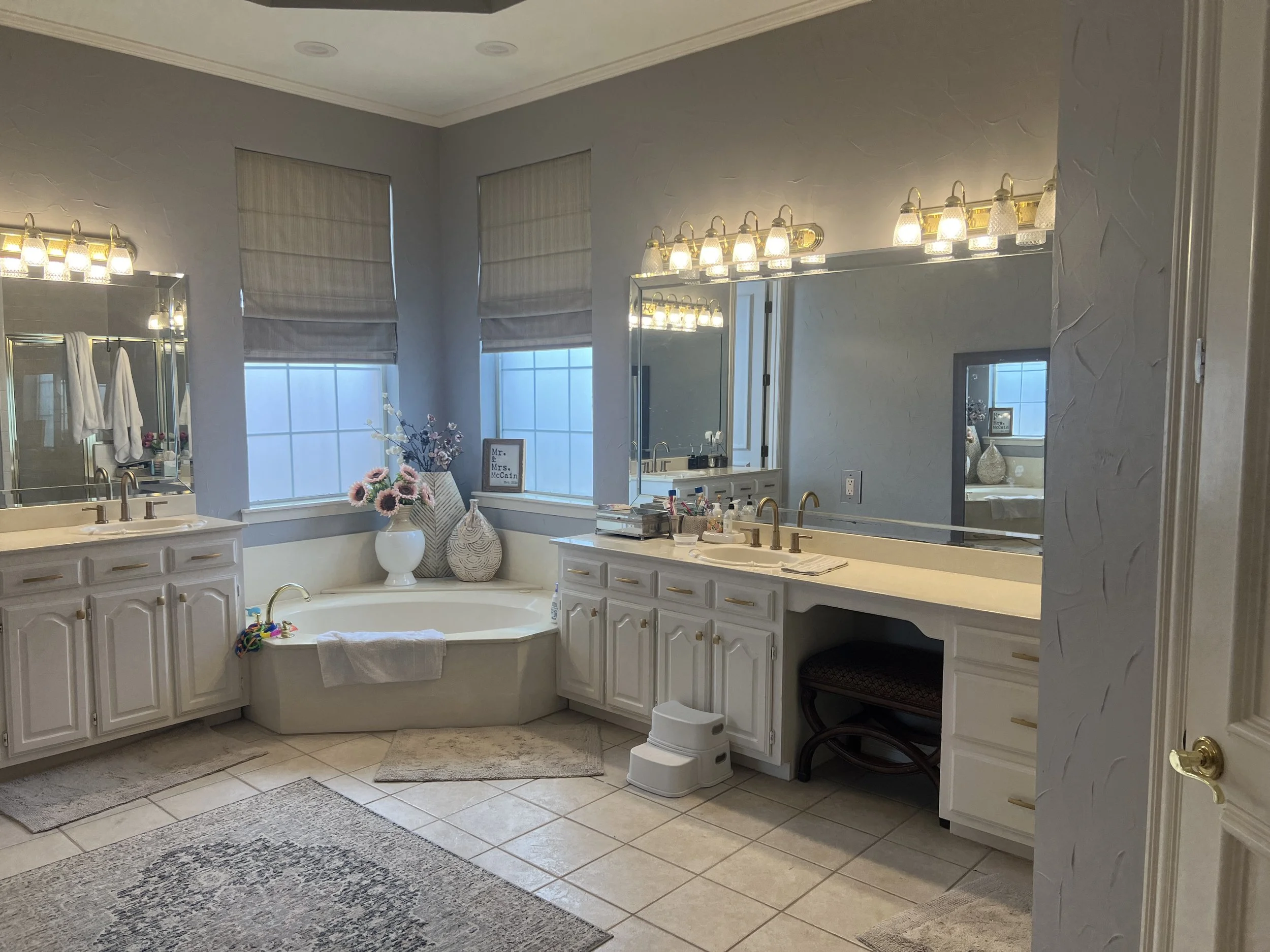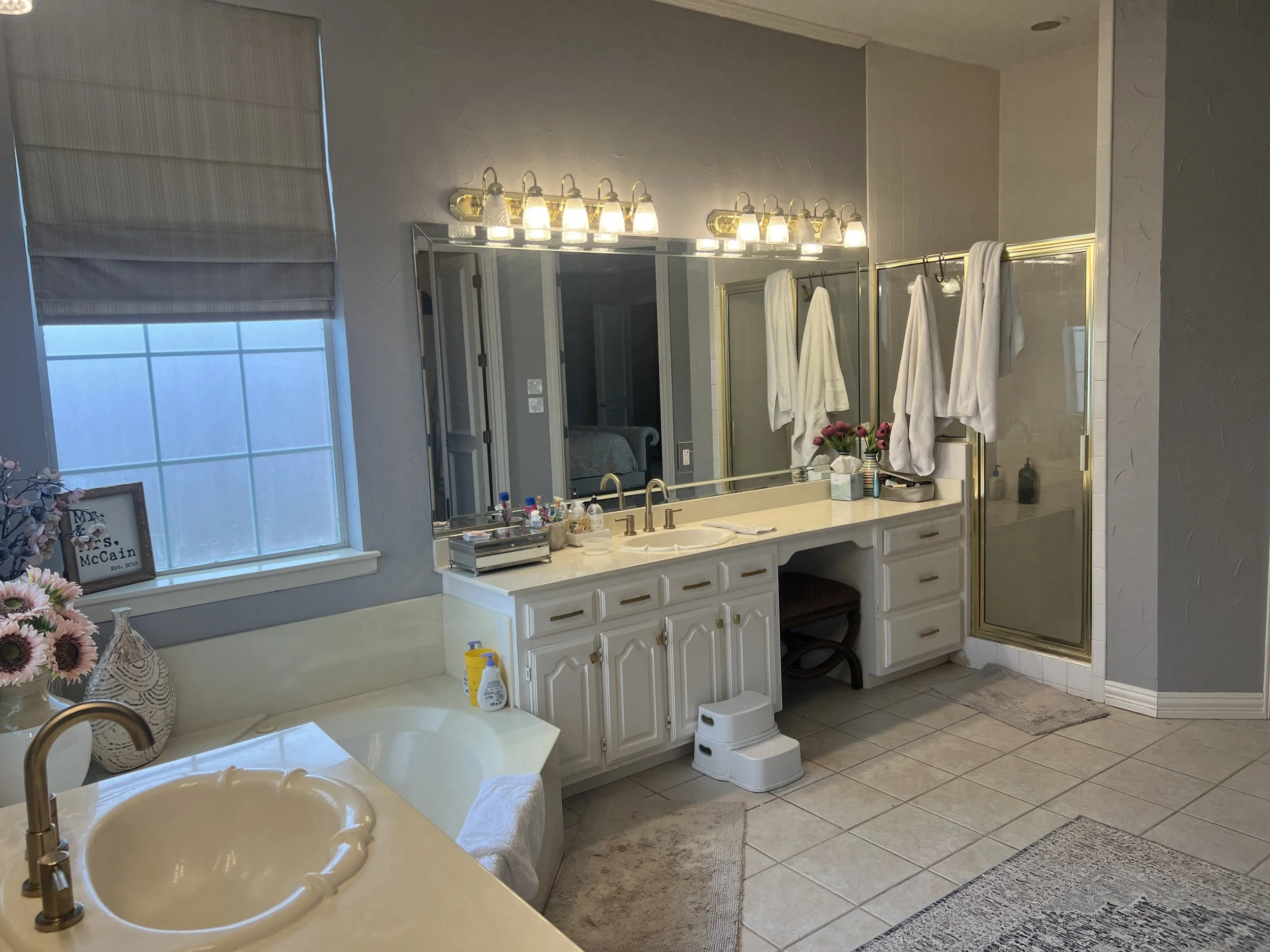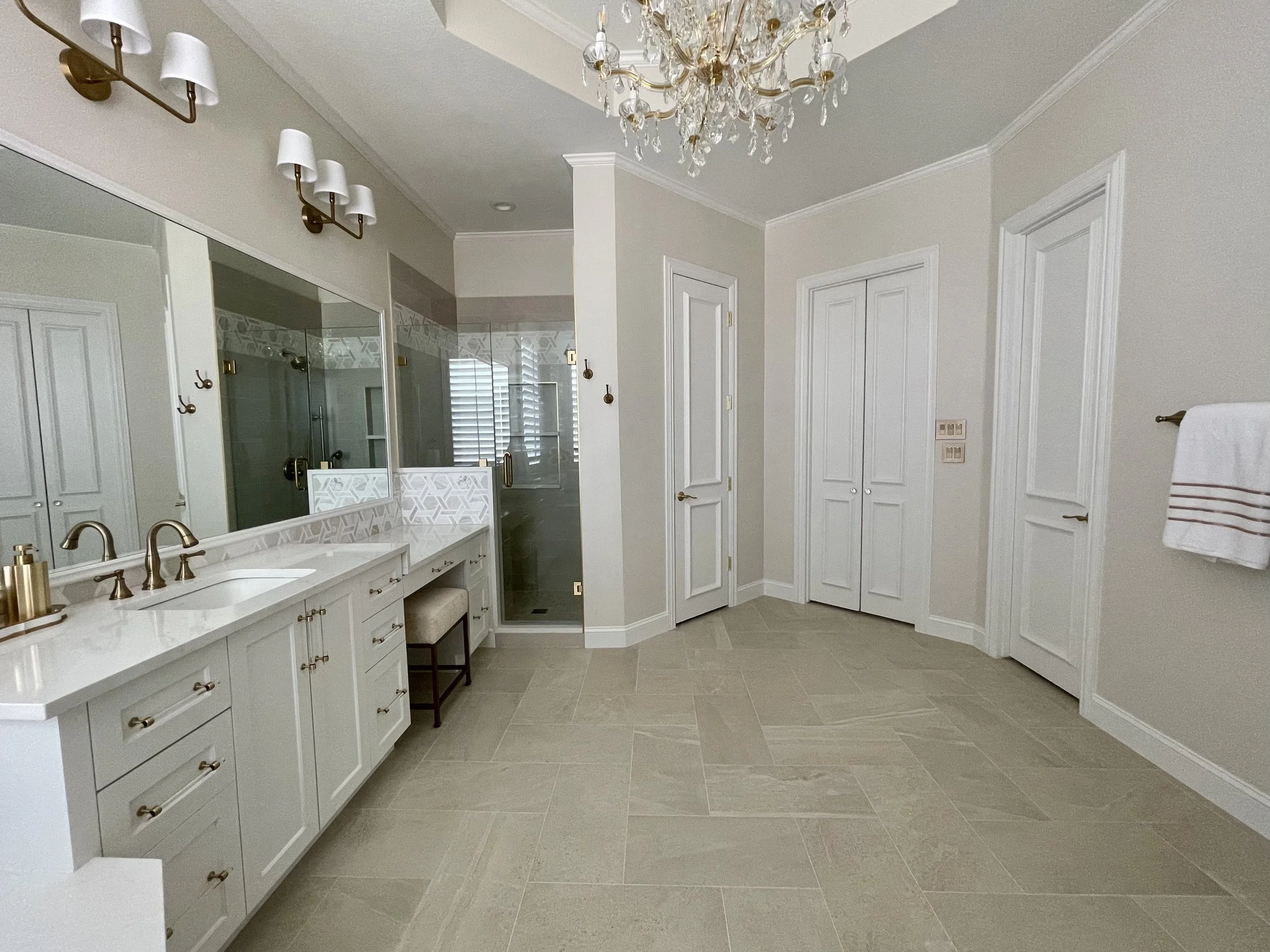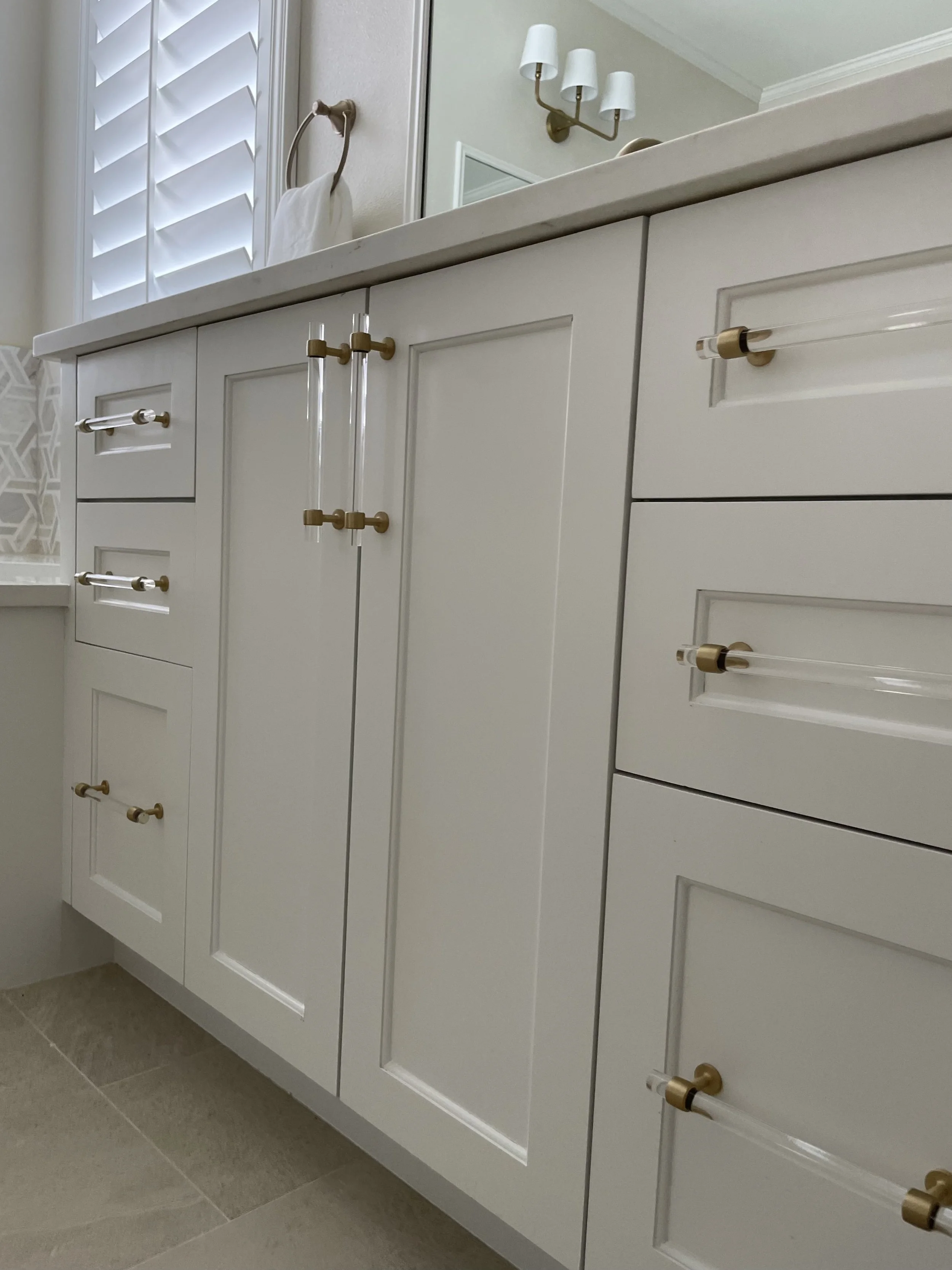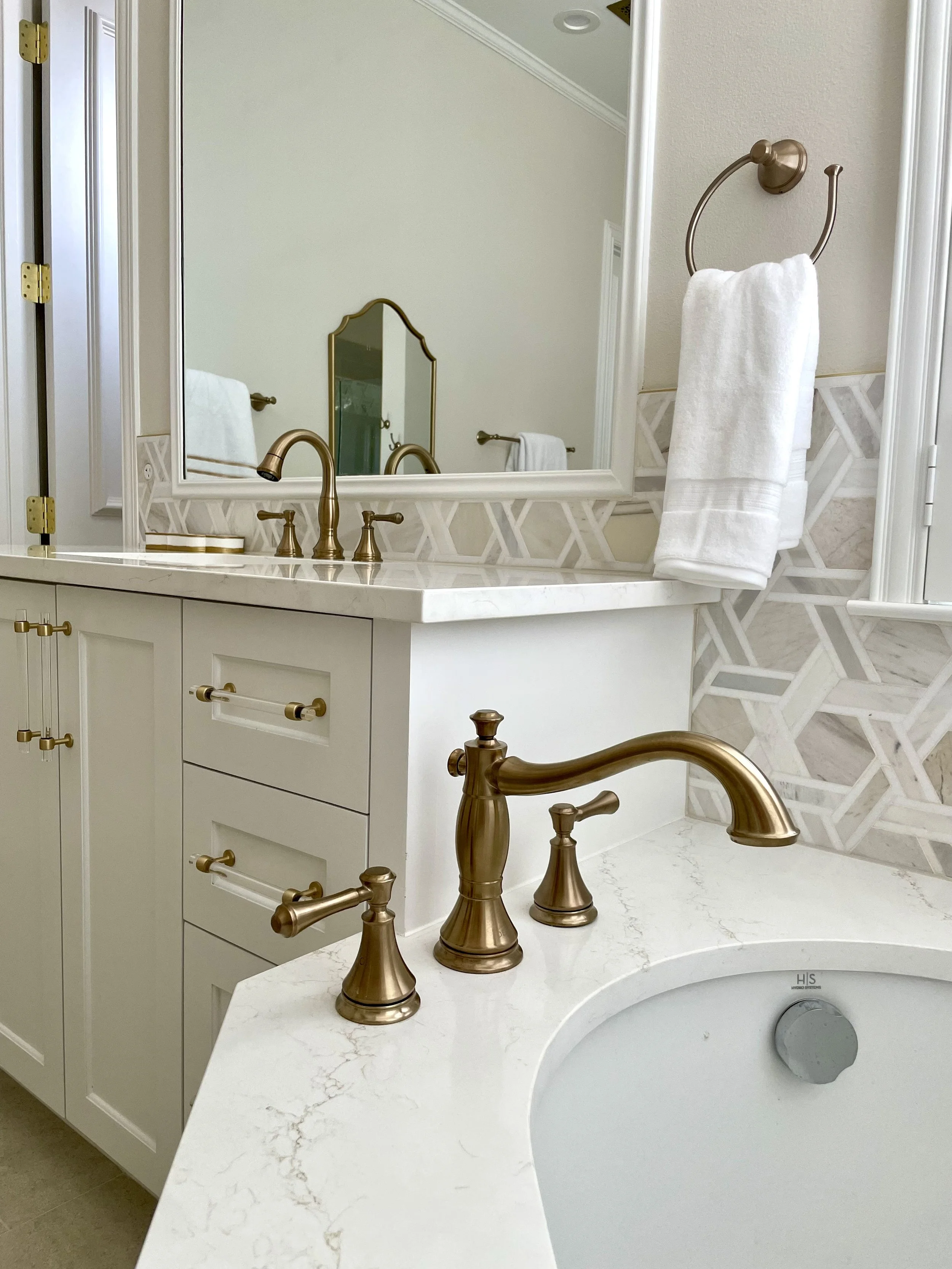 I’m excited to share this primary bathroom remodel! It’s has gold, it has crystals, it has been refreshed and it looks beautiful!