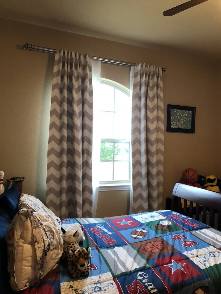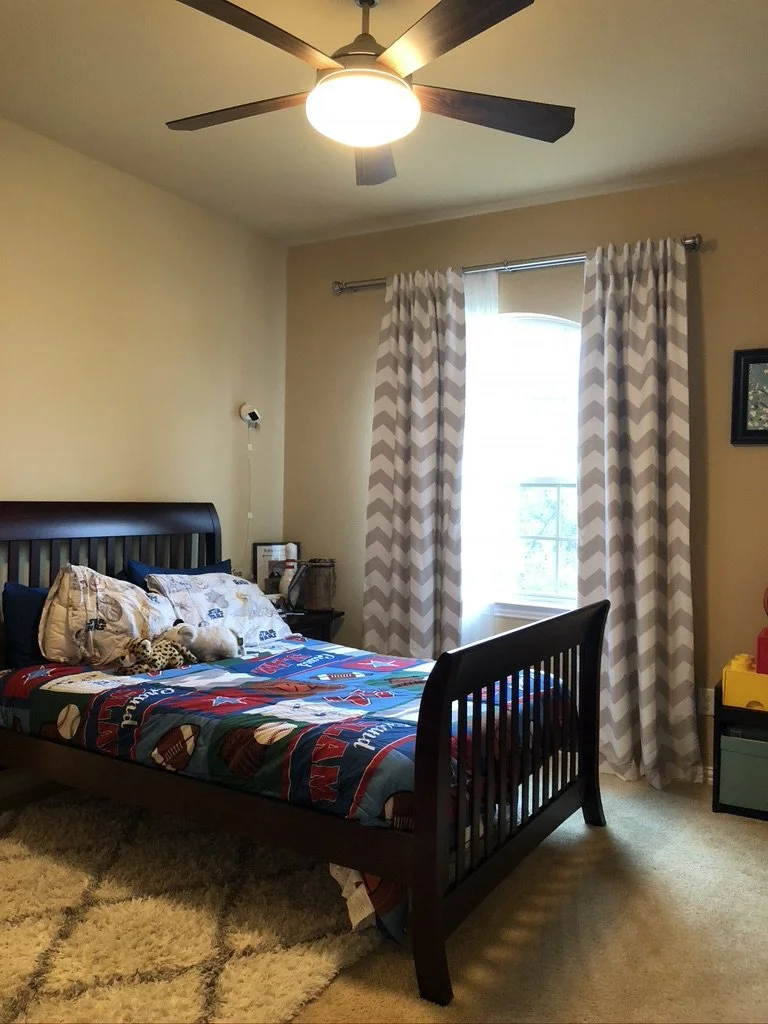 The young boy that this room was created for wanted a space that reflected his favorite sport, his favorite color, and his fun personality. Blue, his favorite color, has been incorporated in the duvet cover, the LED lights, and the rock wall-one of the most unique aspects of this room. It is completely functional and adds a level of both youth and fun to the room. Floating shelves add more space without taking up much, and allow this boy to display his favorite items without cluttering his room. Books and toys can be switched as this child grows older so that his room can grow older with him. We love this room because it is creative, exciting, fun, and functional.