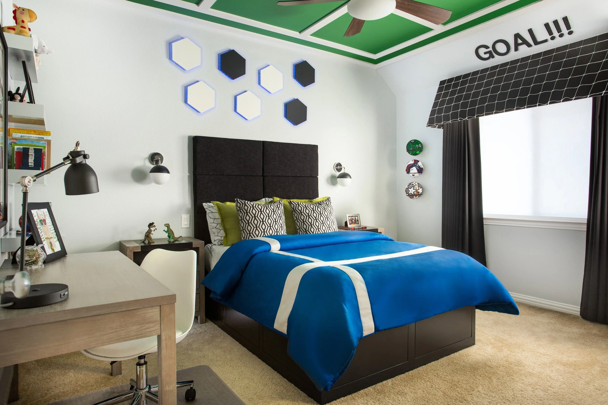 Holly Bellomy with Holly Bellomy Interiors scored another goal with this imaginative, sports-themed child’s room. Tasked with creating a room that reflected this young boy’s favorite sport, soccer, Holly proved once again that she puts the ‘fun’ in functional. The room highlights this popular sport in many ways, and includes: